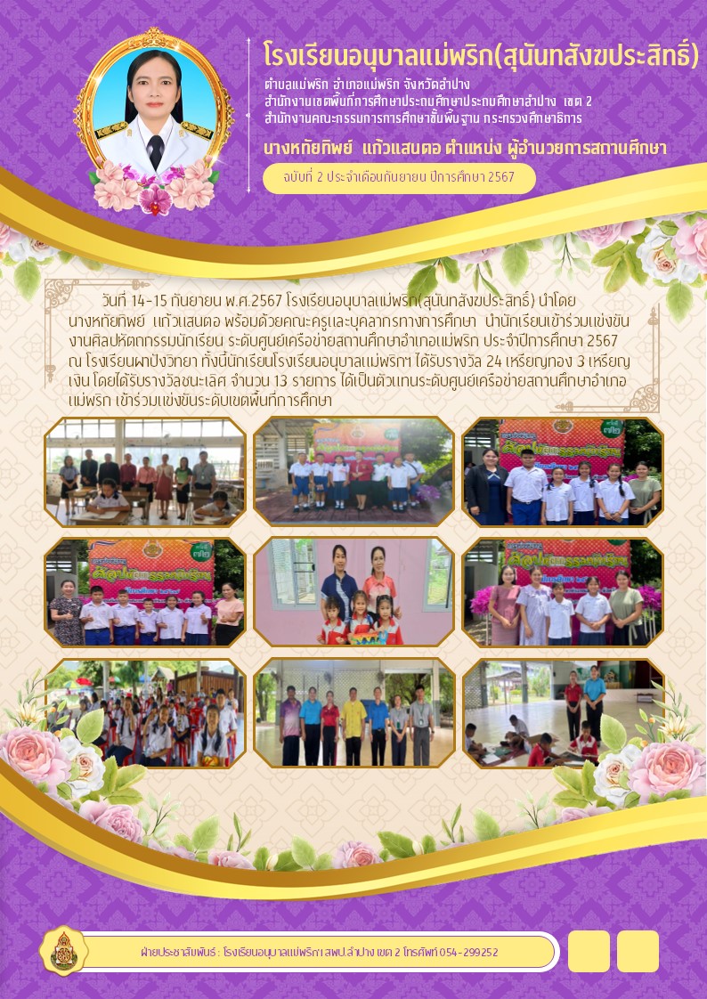 วันที่ 14-15 กันยายน พ.ศ.2567 โรงเรียนอนุบาลแม่พริก(สุนันทสังฆประสิทธิ์) นำโดยนางหทัยทิพย์ แก้วแสนตอ พร้อมด้วยคณะครูและบุคลากรทางการศึกษา นำนักเรียนเข้าร่วมแข่งขันงานศิลปหัตถกรรมนักเรียน ระดับศูนย์เครือข่ายสถานศึกษาอำเภอแม่พริก ประจำปีการศึกษา 2567 ณ โรงเรียนผาปังวิทยา ทั้งนี้นักเรียนโรงเรียนอนุบาลแม่พริกฯ ได้รับรางวัล 24 เหรียญทอง 3 เหรียญเงิน โดยได้รับรางวัลชนะเลิศ จำนวน 13 รายการ ได้เป็นตัวแทนระดับศูนย์เครือข่ายสถานศึกษาอำเภอแม่พริก เข้าร่วมแข่งขันระดับเขตพื้นที่การศึกษา