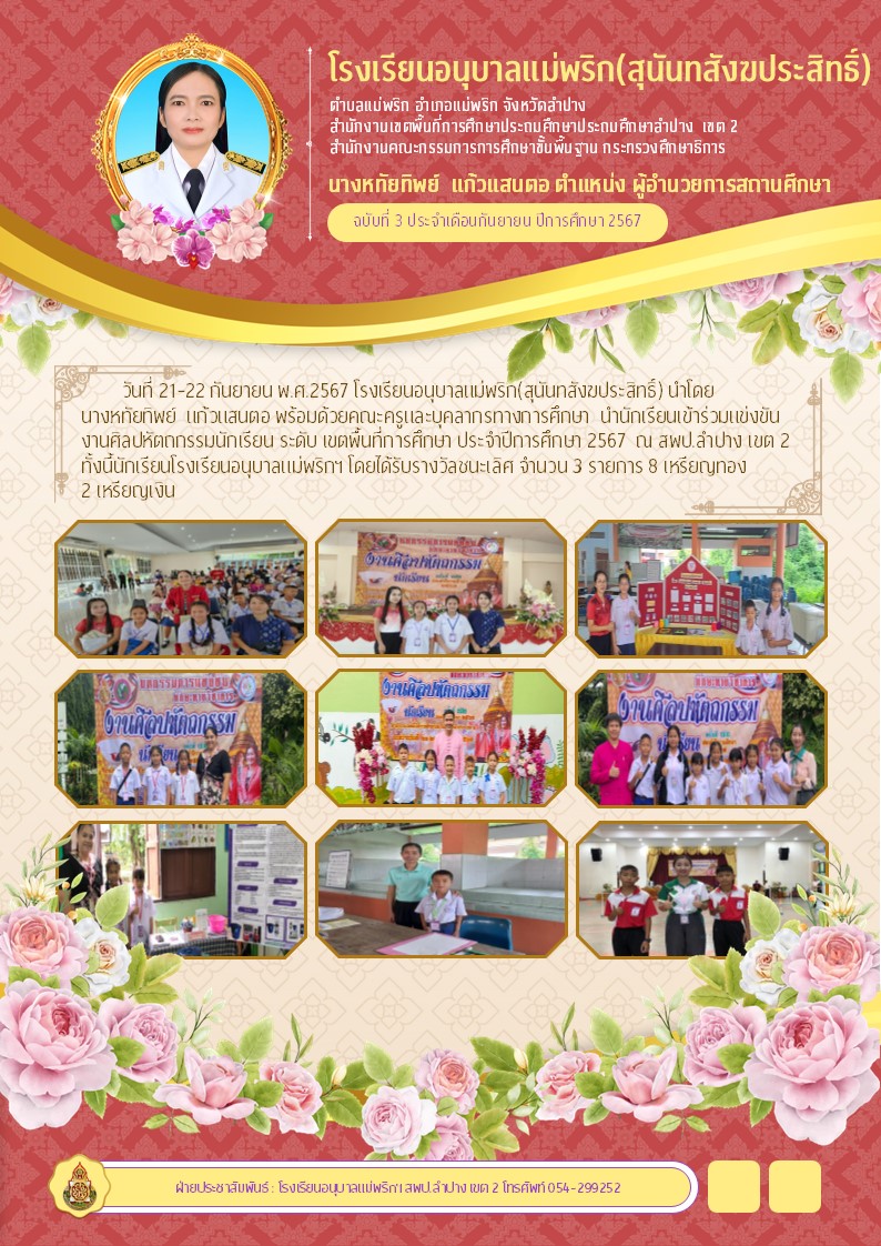 วันที่ 21-22 กันยายน พ.ศ.2567 โรงเรียนอนุบาลแม่พริก(สุนันทสังฆประสิทธิ์) นำโดย นางหทัยทิพย์ แก้วแสนตอ ผู้อำนวยการสถานศึกษา พร้อมด้วยคณะครูและบุคลากรทางการศึกษา นำนักเรียนเข้าร่วมแข่งขันงานศิลปหัตถกรรมนักเรียน ระดับ เขตพื้นที่การศึกษา ประจำปีการศึกษา 2567 ณ สพป.ลำปาง เขต 2ทั้งนี้นักเรียนโรงเรียนอนุบาลแม่พริกฯ โดยได้รับรางวัลชนะเลิศ จำนวน 3 รายการ 8 เหรียญทอง 2 เหรียญเงิน
