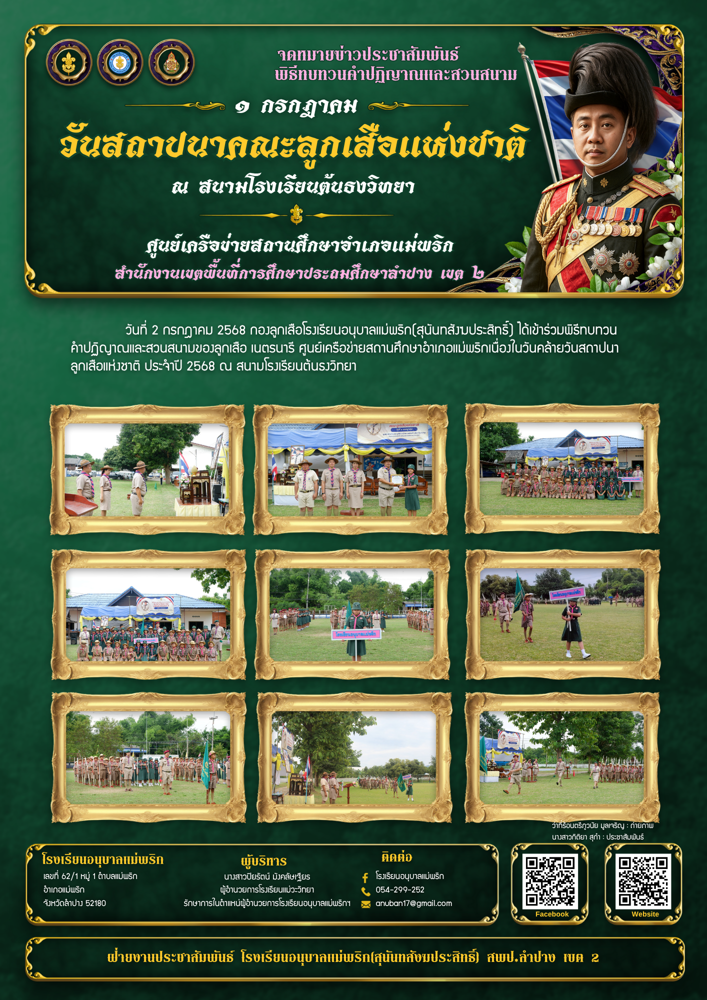 กองลูกเสือโรงเรียนอนุบาลแม่พริกฯ ได้เข้าร่วมพิธีทบทวนคำปฏิญาณและสวนสนามของลูกเสือ เนตรนารี ศูนย์เครือข่ายสถานศึกษาอำเภอแม่พริก เนื่องในวันคล้ายวันสถาปนาลูกเสือแห่งชาติ ประจำปีการศึกษา 2568